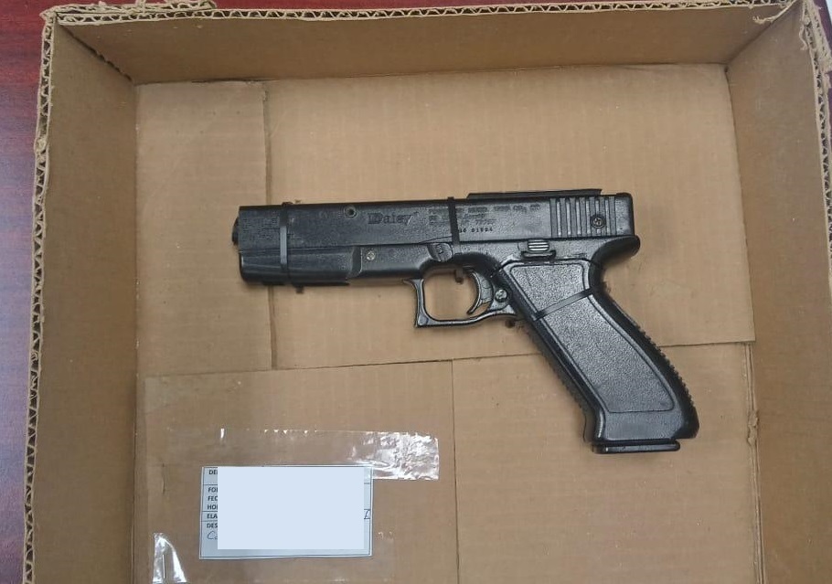 Dentro del auto había cinco personas, una de estas solicitó auxilio, mencionando que lo habían golpeado, señalando a los sujetos que abordaban el vehículo como los responsables de esto, fue así que el operativo aseguró de inmediato a las cuatro personas y continuó con la inspección correspondiente, localizando una pistola de utilería, un machete y un bat.
