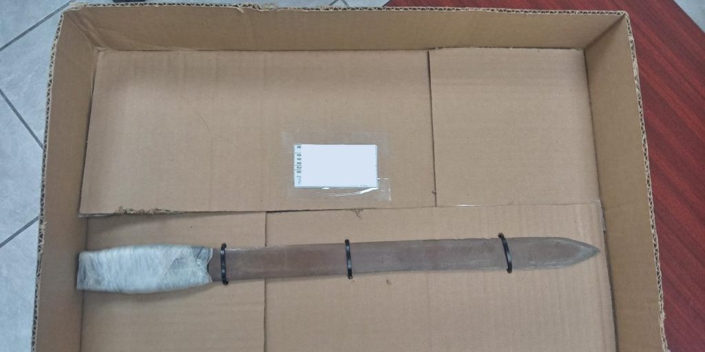 Dentro del auto había cinco personas, una de estas solicitó auxilio, mencionando que lo habían golpeado, señalando a los sujetos que abordaban el vehículo como los responsables de esto, fue así que el operativo aseguró de inmediato a las cuatro personas y continuó con la inspección correspondiente, localizando una pistola de utilería, un machete y un bat.