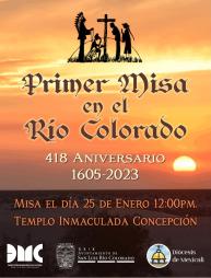 SAN LUIS RÍO COLORADO, Sonora.- Con motivo del 418 Aniversario de la Primera Misa en el Río Colorado (1605-2023), el próximo miércoles 25 de Enero a las 12:00 de mediodía en la Parroquia de la Inmaculada Concepción de esta ciudad, se realizará una ceremonia eucarística de celebración.